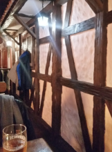 Атмосфера паба мне показалась странной, ИМХО. Зал довольно просторный - компании могут разместиться на разных островках и не мешать друг другу. Интерьер паба пытается окунуть посетителя в атмосферу германского городишки с традиционными белыми домиками "в полоску" - фахверкхаусами (Fachwerkhaus), однако среди бюргерских деталей есть некоторые несоответствия, они вместе с несуразной музыкой испортили общее впечатление. В послеобеденное время здесь было ещё пусто, возможно, потому что сам паб открывается в 15:00 и сам по своей сути является заведением ночных тусовок.