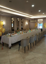 Неплохая кухня, хорошее месторасположение. Но мы больше сюда не ногой. То что по блюдах нам дописали которых мы не обнаружили и бутылок спиртного, это пол беды. Официант возле нашего стола разбил бокал и какое было наше удивление когда мы этот бокал в счете обнаружили! Принесли мясное, и красную рыбу, разложили по тарелкам, пока народ танцевал, официант решил что пора менять тарелки, половина людей не успели даже попробовать блюда. Короче "осадок" остался, хотя когда несколько лет назад были на банкете, все было хорошо..