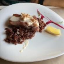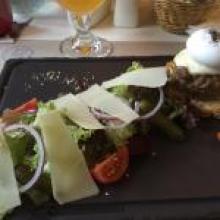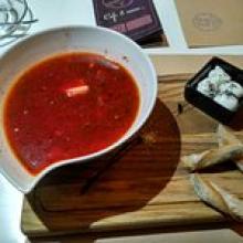 Зашли сюда, как гости города, и зная о награде Ревизора. Симпатичное место. Чёрный бургер с телятиной - это две пересушенных гренки, между которыми котлета, сыр и салат, вкусом из Мака. Мясо дорблю было вкусным, к нему сырный соус из рокфора - никакой. Удивило красное картофельное пюре со вкусом свеклы. Миндальный латте - просто кофе с сиропом. Не впечатлило.