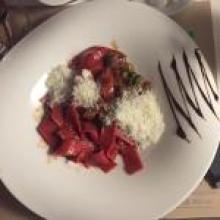 Был приятно удивлён, не типичное заведение с интересным и вкусным меню. На фото фиолетовые вареники с мясом. Пробовали многое, все очень достойно.